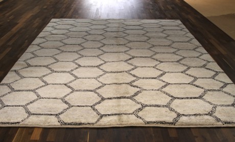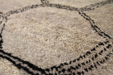Right now, we have 2 dif­ferent Beni-​​style rugs in-​​stock. Both are hand­made in Turkey, and are 100% wool. The hexagon shaped pat­tern (pic­tured above), and the dia­mond shape pat­terned rugs.