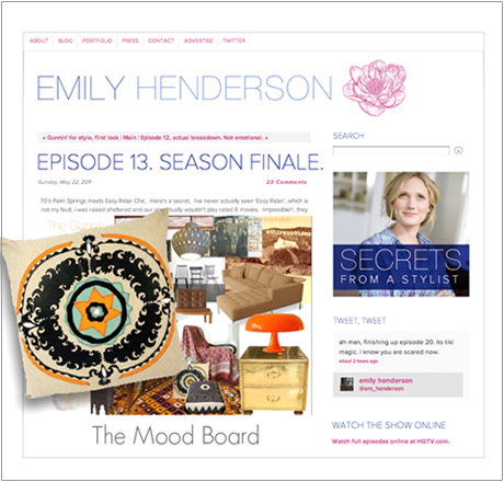 We just love 2010 HGTV Design Star winner Emily Henderson’s blog, so it was a real treat to spot our Suzani Tribal Throw Pillow in Orange on the mood board in episode 13 of her new TV show, Secrets from a Stylist. Her first episode fea­tured Emily working on Glee co-​​creator Ian Brennan’s eclectic bun­galow in Los Angeles.