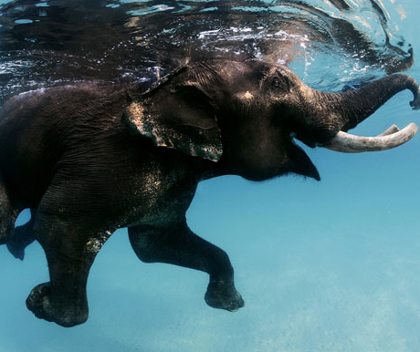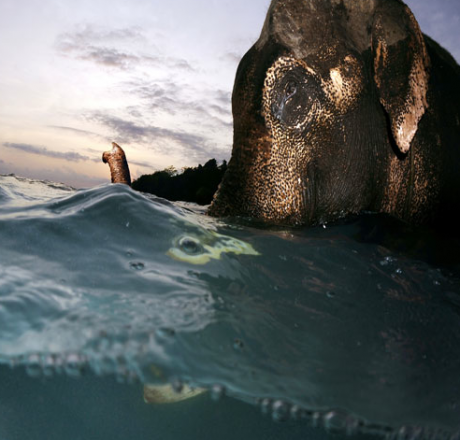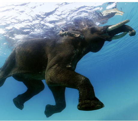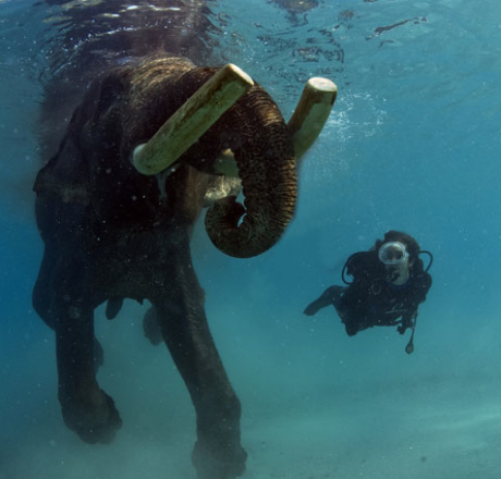 I always heard the phrase “swim­ming with the sharks.” But swim­ming with the ele­phants?  The Tele­graph recently posted a story about the last swim­ming ele­phant in the Andaman Islands.