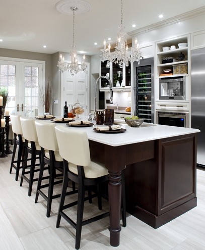 By Clayton Gray Home | Published May 1, 2012, 10:08 PM | Full size is 407 × 495 pixelsThe crystal chandeliers help to add femininity to a rather sterile, streamlined kitchen.